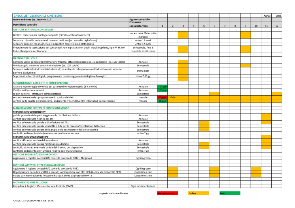 1. Gestione materiali conservati 2. Ispezione pellicole 3. Monitoraggio ambiente di conservazione 4. Manutenzione sistemi di condizionamento 5. Gestione ingressi/uscite archivio 6. Gestione attivitĆ ditte pulizia archivio 7. Movimentazione pellicole